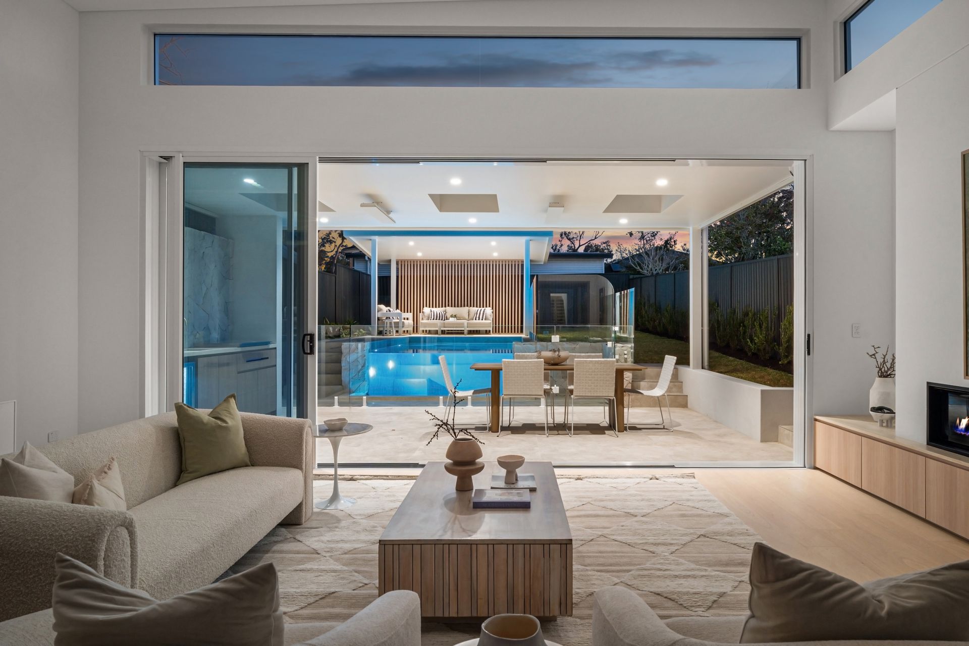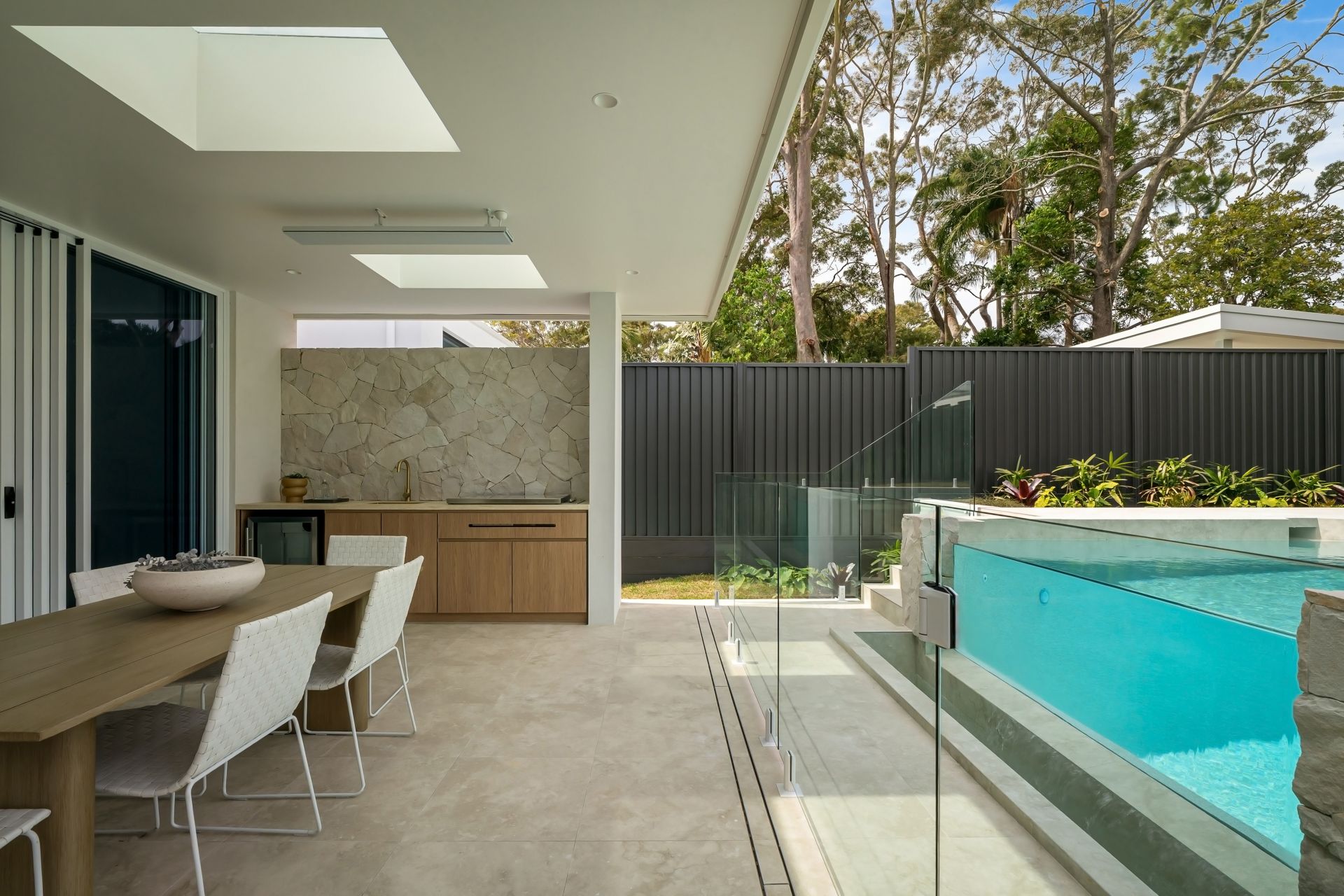 Accommodation comprises five private bedrooms, including a master suite with walk-in wardrobe, resort-inspired ensuite, and private balcony. Outdoors, a spill-over glass edge pool and landscaped gardens create a private oasis for relaxation or entertaining.
