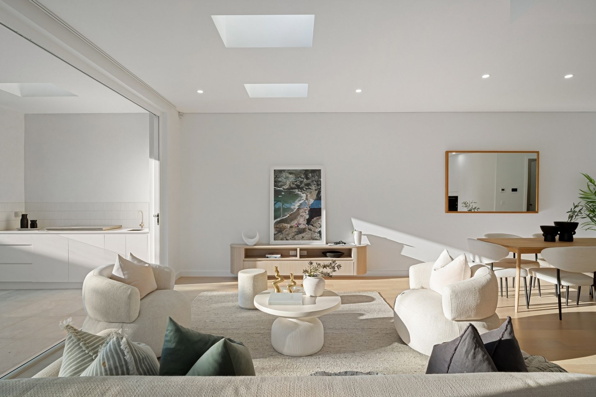 Light-filled interiors are enhanced by wide-plank Beach Oak timber flooring, while plush knot wool carpets bring warmth and refinement to the bedrooms. Four generously scaled bedrooms include a grand master suite with private ensuite and walk-in robe, while two expansive living areas cater to both family comfort and sophisticated entertaining.