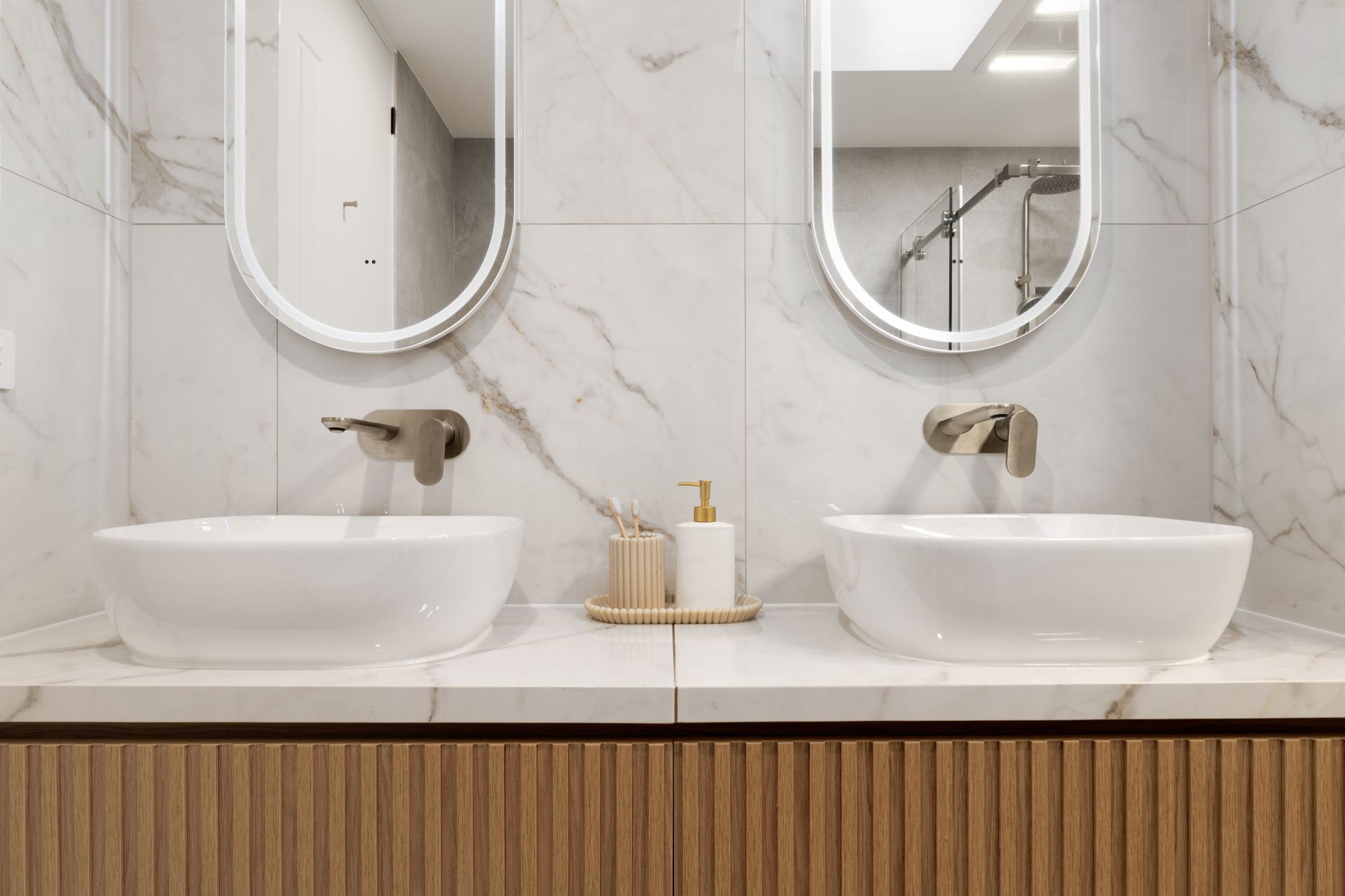 - Exquisite material palette featuring stone cladding, timber detailing, engineered and natural stone surfaces, and brushed gunmetal finishes