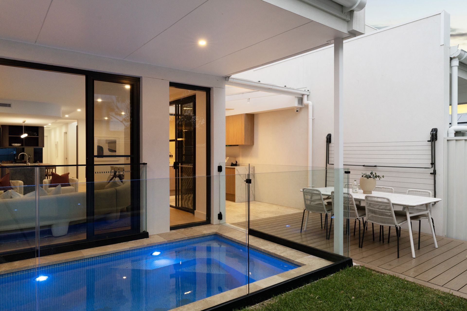 - Expansive open-plan living and dining framed by floor-to-ceiling glass, complemented by an electric fireplace for ambient warmth